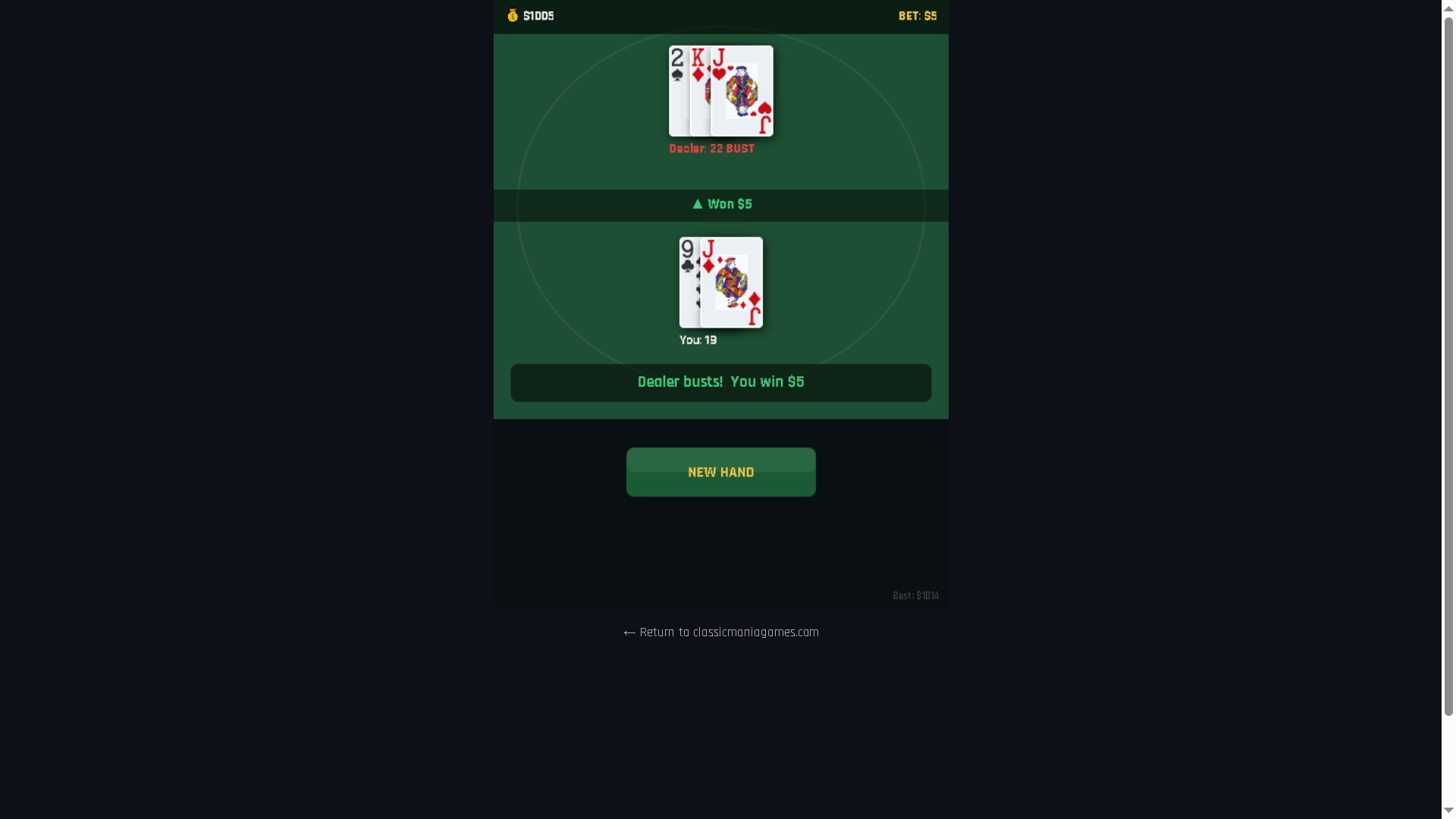 This version of Blackjack is built with pure HTML5 Canvas and runs entirely in your browser, on any device, with no plugins or downloads. The game uses a six-deck shoe — the same setup found in most real casinos — and reshuffles automatically when the deck runs low. Sound effects accompany every action, from the crisp sound of each card being dealt to a triumphant fanfare when you hit Blackjack. Your balance and personal best are saved locally so your progress is there whenever you return.
