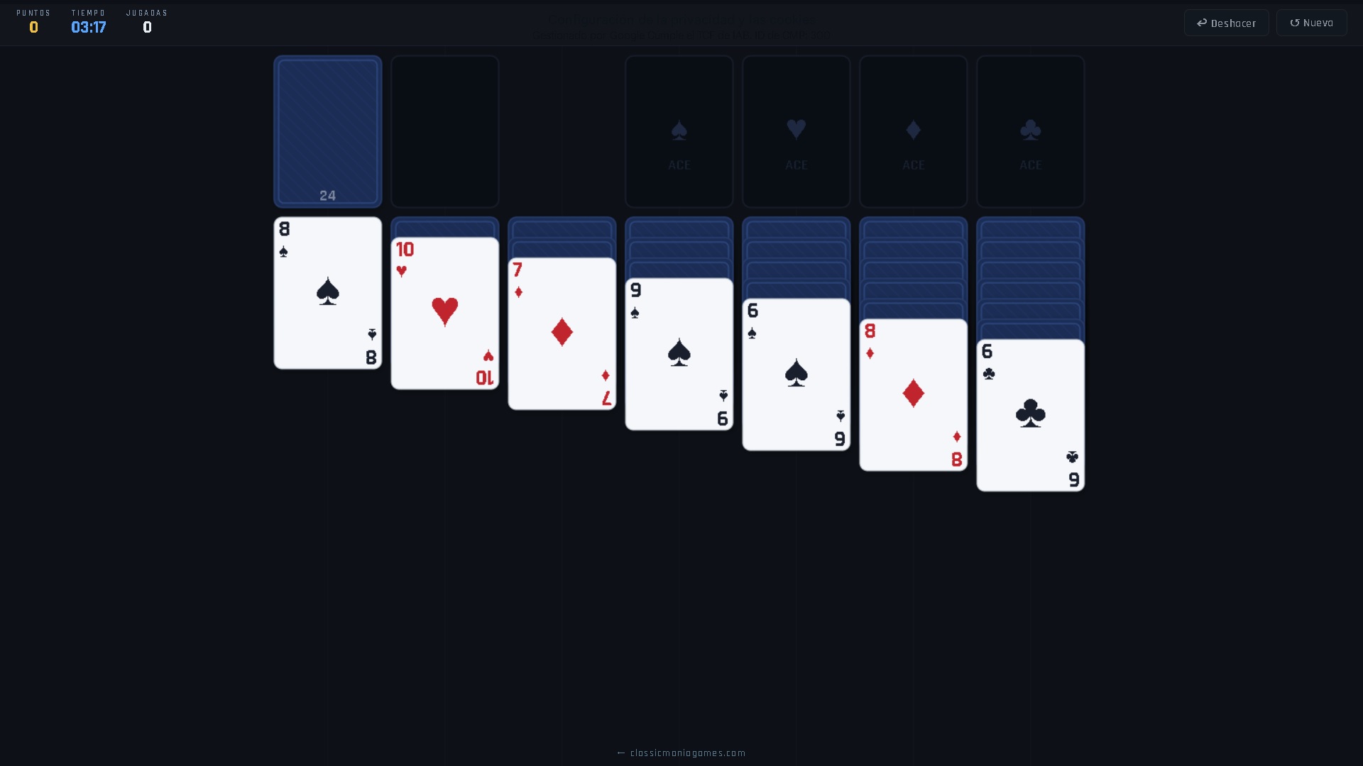 En ClassicMania Games puedes jugar al Solitaire Klondike directamente en tu navegador, sin descargas, sin registro y sin publicidad intrusiva. El juego está desarrollado en HTML5 puro, lo que garantiza que funcione perfectamente tanto en ordenadores de escritorio como en tablets y teléfonos móviles, con soporte completo para ratón y pantalla táctil.