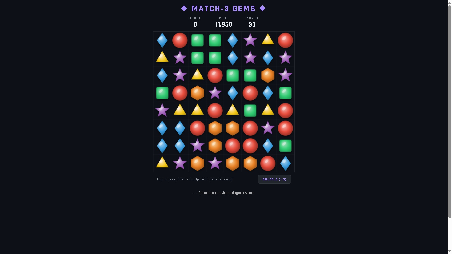 Match-3 Gems is a classic puzzle game where you swap adjacent gems on an 8×8 grid to line up three or more of the same type in a row or column. When a match is made, the gems disappear, new ones fall from above, and the board rearranges itself — sometimes triggering a chain of automatic matches called a combo. The goal is simple: score as many points as possible in 30 moves.