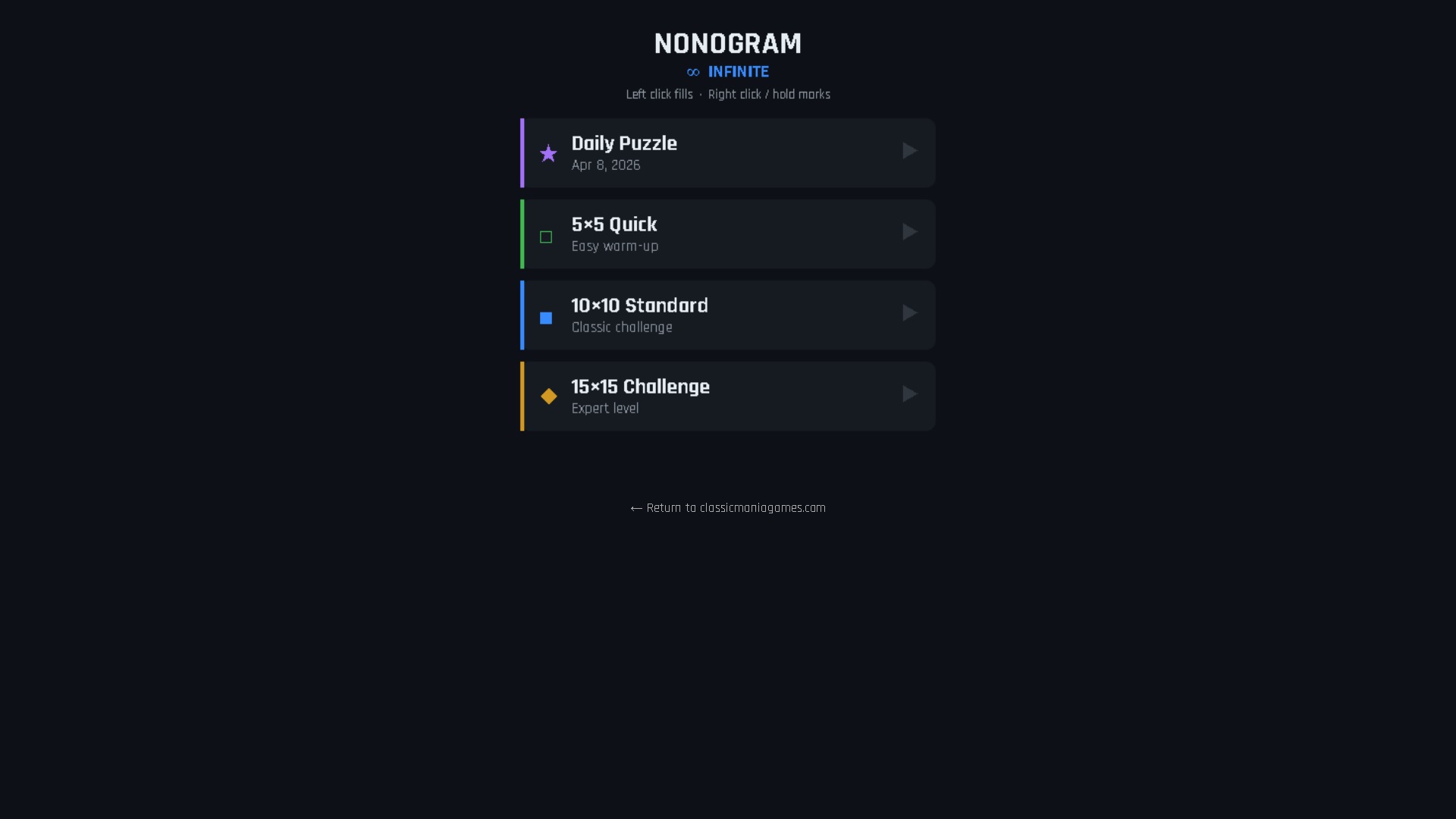 The 15×15 grid is for experienced solvers only. The number of cell interactions grows sharply with grid size, and a single deduction can cascade across a dozen lines at once. Set aside thirty minutes and enjoy the ride.